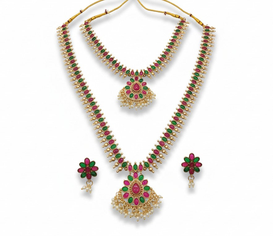 Gold-Plated Temple Jewelry Set | Red and Green Stone Haram Combo with Earrings