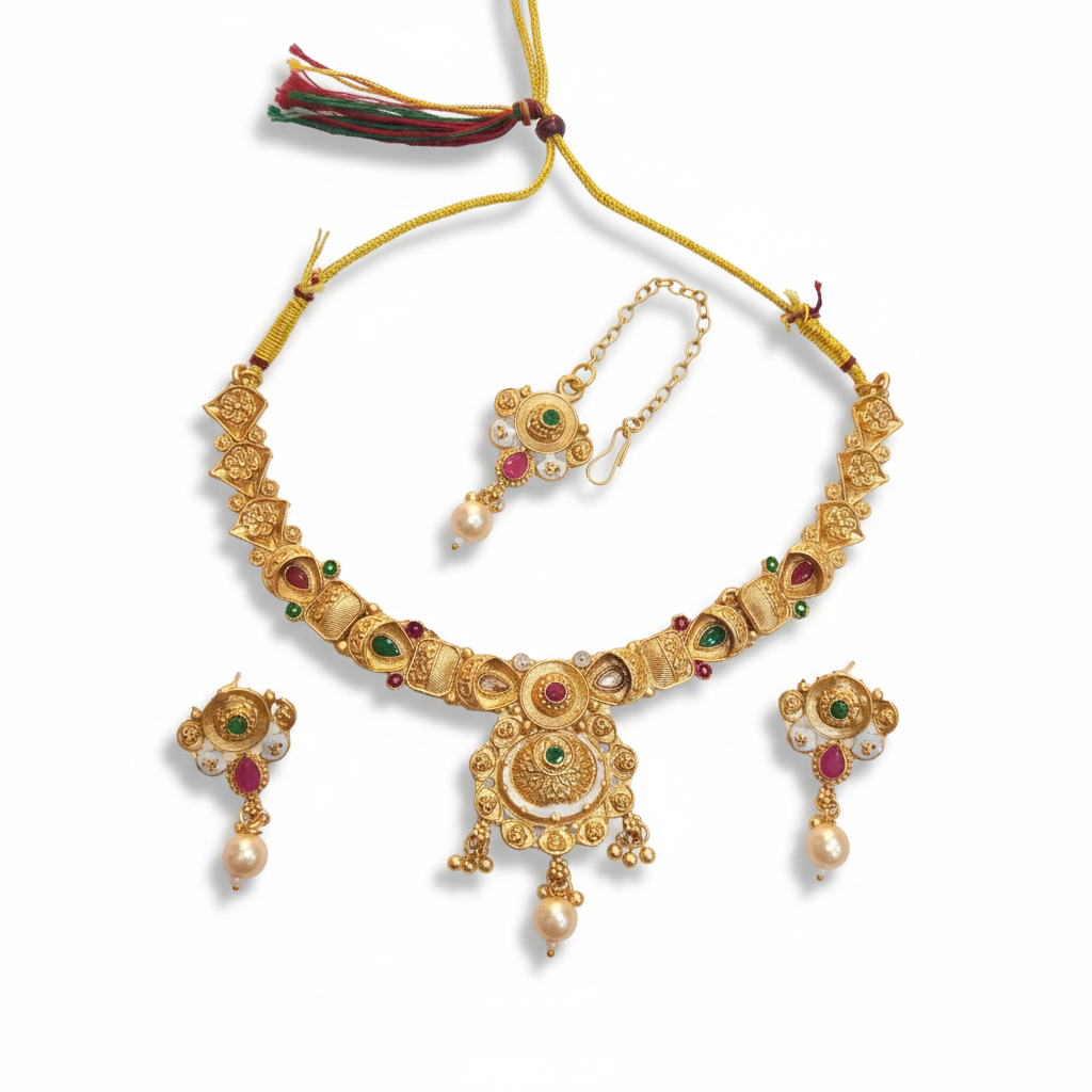 Antique Gold Plated Choker Necklace Set with Maang Tikka & Earrings | Kundan Bridal Jewelry
