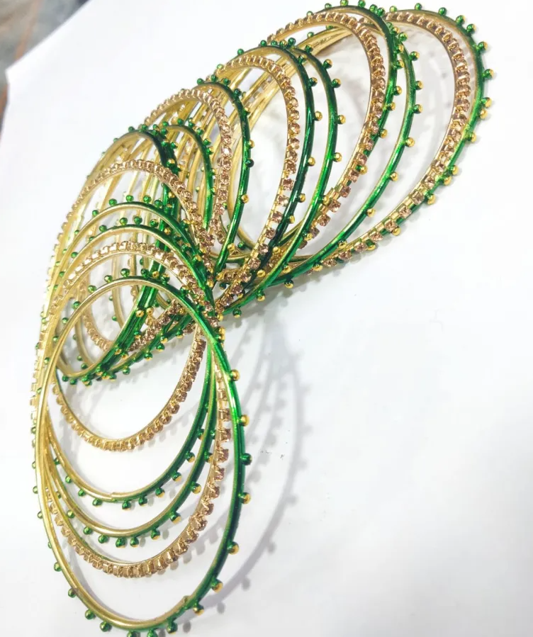 Size : 2.2, 2.4, 2.6, 2.8 Product Details : Vibrant Green and Gold Studded Bangle Set A stunning set of bangles featuring alternating deep green and sparkling gold-toned bangles. The gold bangles are adorned with numerous small, glittering stones, creating a festive and traditional look perfect for celebrations and special occasions. Base Metal : Alloy Occasion : Ethnic, Western Plating : Gold Plated Size : 2.2, 2.4, 2.6, 2.8